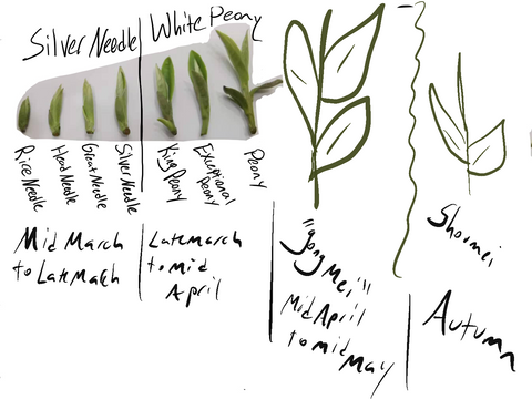 Baimudan, White Peony, harvest dates are set at beginning March 15th and ending April 30th. As pictured above, there are three grades of White peony that all fall within this harvest range: King Peony, Exceptional Grade Peony, and regular White Peony. One point of note here is that there is also an Autumn harvest of Baimudan beginning August 15th and ending September 15th.